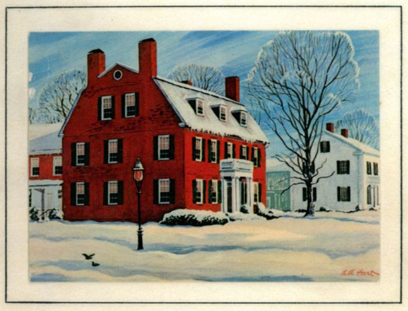 For eight years beginning in 1961 a copy of original artwork by the artist Arthur A. Hart was showcased on the cover of the Longmeadow, MA Annual Town Reports. Prof. Hart was a talented artist and he also was the Chairman of the Art Dept. at Bay Path Junior College in Longmeadow. During that eight year period town residents could view a well recognized scene in Longmeadow on the cover of the Annual Town Report that is published every year. Most of the covers were his depictions of historical houses in town with a description, so everyone could also learn some Longmeadow history.